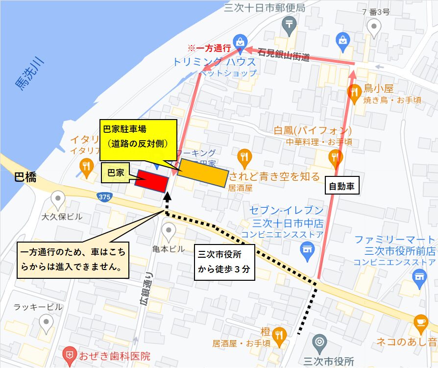 自動車で来られる方は「巴家」の前の道は一方通行なので広銀方向からは入れません。ご注意ください。